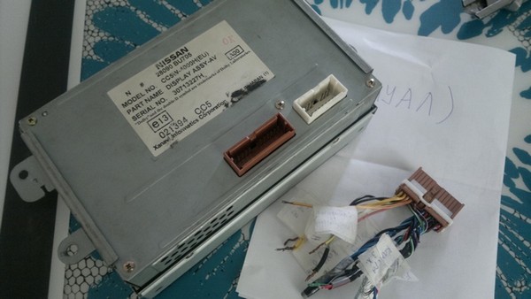 С продавцом обговорил заранее, чтобы в комплекте с монитором отправил разъем с куском жгута проводов. Кстати про разъемы: до 2003 года на люксах N16 монохромные мониторы подключались через такой-же коричневый разъем как у тиновского монитора, есть подозрение что на этих машинах даже с проводкой ничего делать не надо, просто заменить монитор. У меня же машина 2005 года, поэтому пришлось срастить коричневым разъемом, просто, по схемам, провод к проводу, цвета совпадают (кроме провода подсветки-разные по цветам). И вот настал момент истины: монитор подключен, включаем зажигание и…На дисплее появляется надпись NISSAN! Радости были полные штаны)