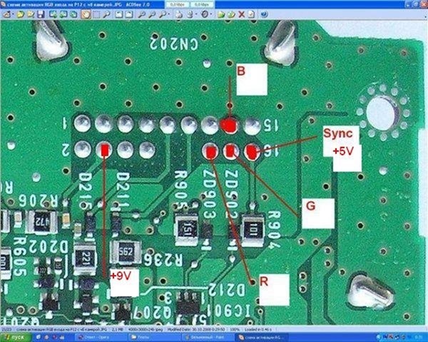 Оказалось, как и на многих ниссановских мониторах для активации видеовхода, нужно лишь подать на указанный пин +9В и соответственно RBG видеосигнал + сигнал синхронизации. Теперь при нажатии кнопки MAP видим картинку с внешнего видеоисточника. Осталось воплотить всё это в натуре.