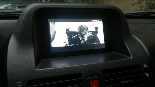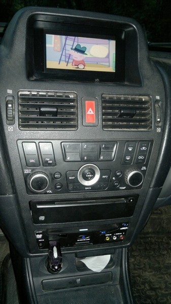 Работает все это дело так: на магнитоле перехожу на АМ диапазон, включается аудиовход, активируется видеовход на мониторе; нажимаю МАР, монитор переключается на внешний источник видеосигнала экран тёмный; с пульта включаю плеер, ну а дальше как дома)