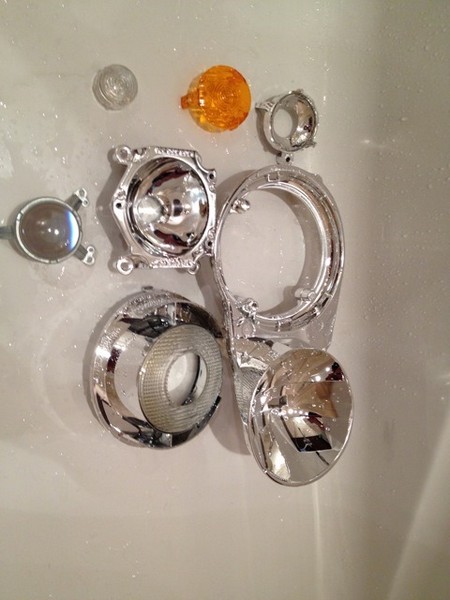 Конечно же я надеялся обойтись малой кровью и первым делом полез мыть фары. Процедура простая: снимаем фары, вынимаем все лампочки, снимаем би-ксеноновый модуль и моем фару. Моем с пару капель фери и тряпочку внутрь. Раз 6-7 полоскал, в конце, что бы не было разводов от воды промываем дистиллированной водой и оставляем сушиться. У меня сохли ночь. С модулем — аккуратно протер, на нем действительно образовался слой пыли в вперемешку с грязью, что безусловно влияло на качество света, но, к моему разочарованию, отражатель уже начал мутнеть. Собрал всё, поставил и, хоть света стало и больше, но для меня не достаточно.