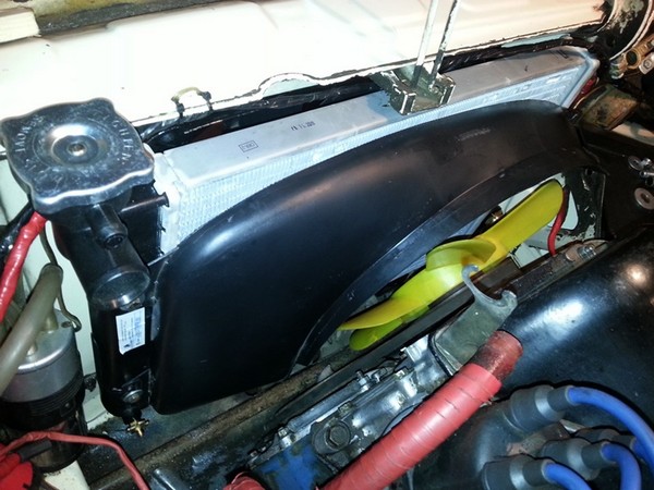 Летом с электро-вентилятором мне ездить не нравиться из-за постоянных его включений и высокой температуры. И где-то года четыре игрался перекидкой на лето обычной крыльчатки на шкив помпы. Летом он гораздо лучше охлаждает. Надоело мне это дело и решил я установить сразу оба. Сдвоенные нивовские вентиляторы на сток мотор нет смысла ставить, да и петли капота переносить надо. Место перед радиатором позволяет перенести эл.вентилятор на другую сторону. Спереди у меня размещались все дудки сигналов, пришлось их временно снять. После примерки стало видно, что немного лишнее и не позволяет встать эл.вентилятору, как нужно. Первое - было срезано крепление с правой стороны вентилятора и согнуты в разные стороны полоски корпуса, просверлены новые отверстия под крепёж.