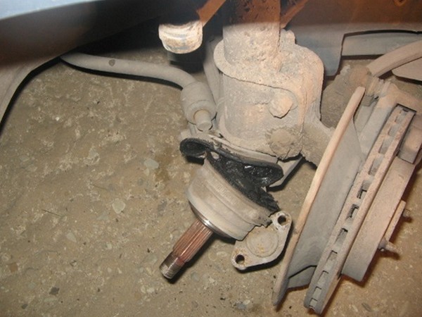 7. Оттягиваем поворотный кулак со стойкой, чтобы шлицевая часть ШРУСа вышла из ступицы. Эту процедуру лучше всего проводить вдвоём (я справился один).