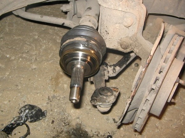 8. Далее нужно сам ШРУС снять со шлицов привода. Для этого один человек должен держать привод, а другой через проставку (желательно, из мягкого металла, например, медь, латунь или бронза) бить молотком по ВНУТРЕННЕЙ обойме. По наружней или по корпусу ШРУСа бить нельзя, так как это приведёт к выходу его из строя. Также можно использовать съемник