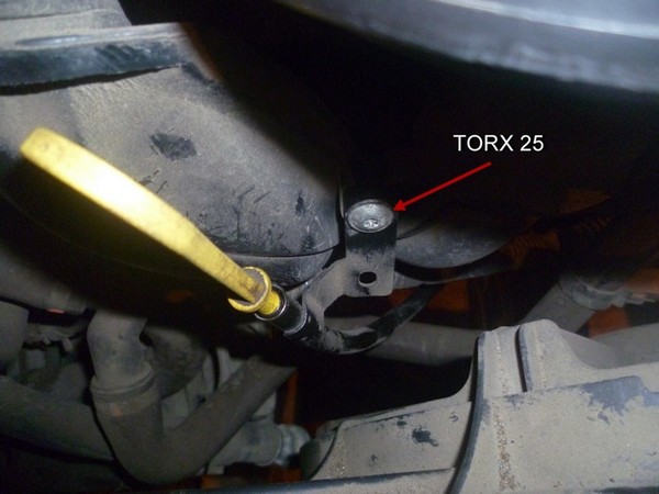 4. Откручиваем крепление щупа для проверки уровня масла в двигателе ключом TORX T25 и выдергиваем щуп (красный). Проверяем наличие резинового уплотнительного кольца на конце щупа
