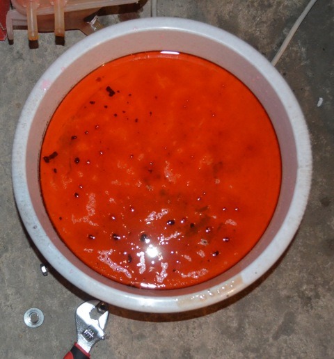 Новую жидкость разбавляли 1 к 1 с дистиллированной водой. Сначала влили 3л, ушли только так, долили еще 1,5, встала на уровень max. С открученной крышкой бачка завели двигатель и начали интенсивно прожимать все шланги чтобы выгнать воздух из системы. Продолжалась процедура не мало, пару раз доливали понемногу, когда жидкость перестала уходить и движок прогрелся до рабочей температуры (гараж холодный и пришлось долго прогревать, держал для ускорения обороты на 2000) закрутили крышку и стали ждать включения вентилятора.