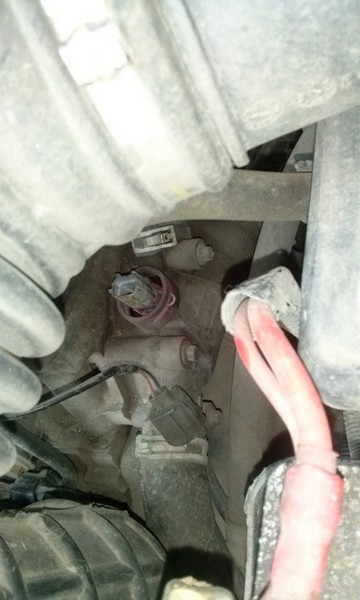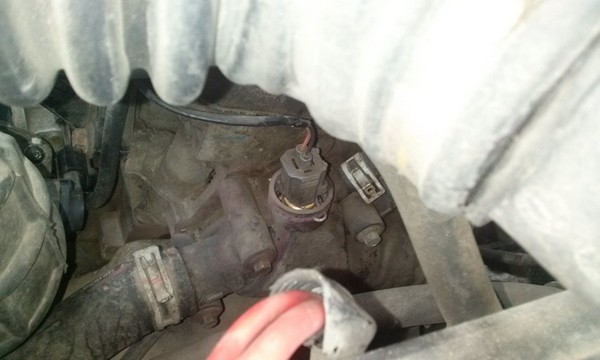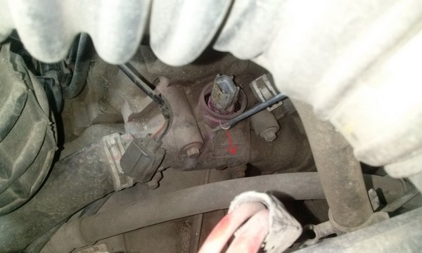 Датчик находится справа от двигателя в корпусе термостата (2-е фото).