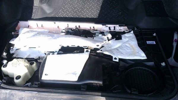 Добраться до этих динамиков не просто. Необходимо снять пластиковую полку, закрывающую динамики. Процесс трудоемкий и не тривиальный. Операция (в рамках разбора и шумоизоляции салона).