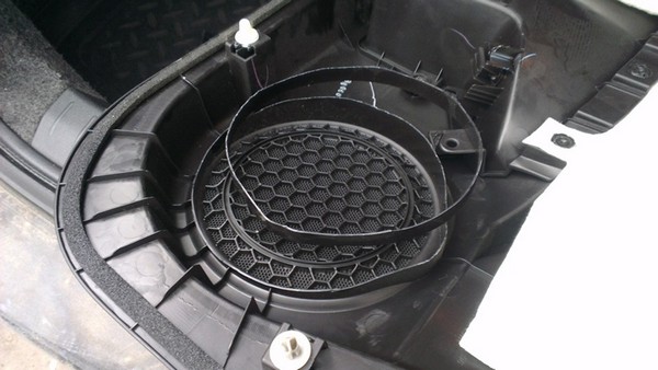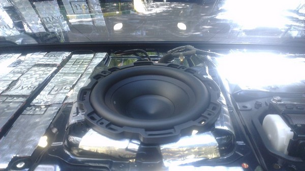 Как уже писал, акустика эта имеет посредственное звучание. Тыловые широкополосники, как и динамики во всех дверях имеют основную болезнь — трескается, либо отклеивается диффузор. Поэтому, тыловые динамики идут под замену. Штатный сабвуфер играет сносно (на сколько это возможно при том, что установлен он открытым способом). Но раз уж я разобрал пол салона, чтобы добраться до задней акустики, решил заменить и его.