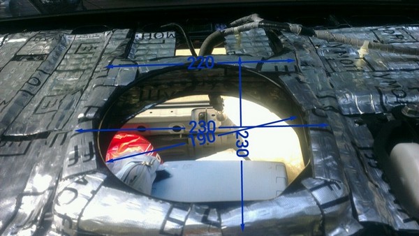 Устанавливать динамики будем на подиумы из фанеры. Габариты штатного отверстия в полке: