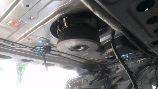 Что касается сабвуфера — какой бы динамик мы не поставили в штатное место, он все равно останется только басовой подзвучкой, но никак не полноценным сабом. Виной тому место установки — задняя полка. Полка сделана из тонкого металла, дребезжит и звенит. Сверху металлической полки находится огромная пластиковая декоративная полка, которая добавляет порцию призвуков. Звук от динамика уходит в никуда — частично растворяется в большом багажнике, частично тонет в дребезжании полки.