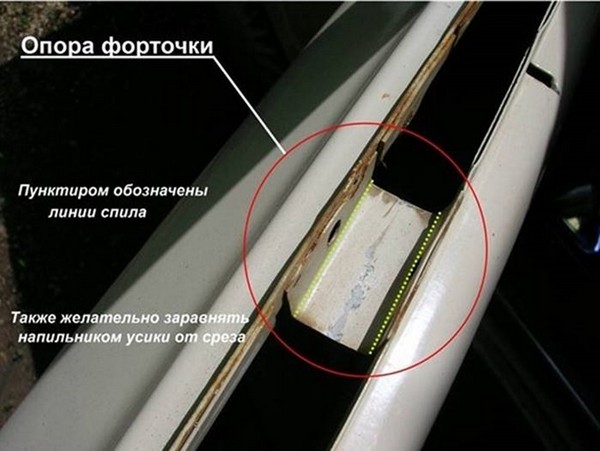Не забудьте в торце двери, где будет стоять зеркало, сделать отверстие и закрепить его на шуруп (саморез), так как на скорости, с открытым стеклом, его может вырвать ветром, так как оно держится только в потае стоики.