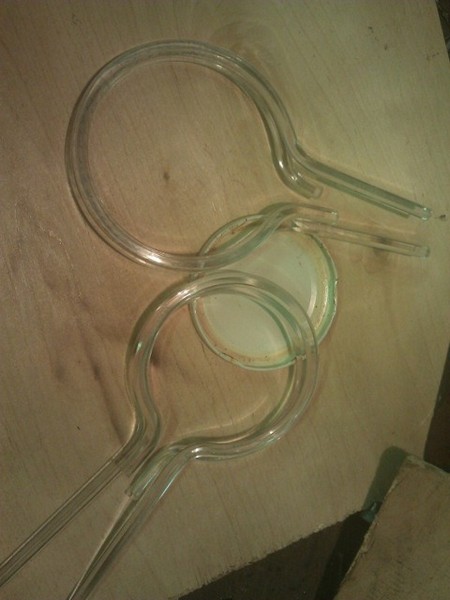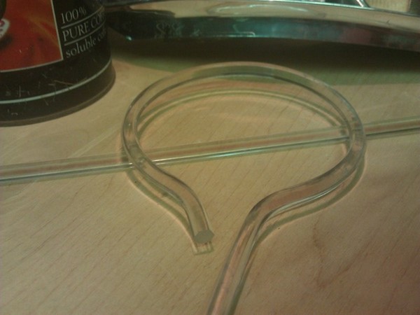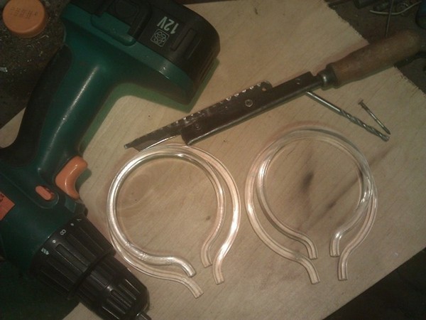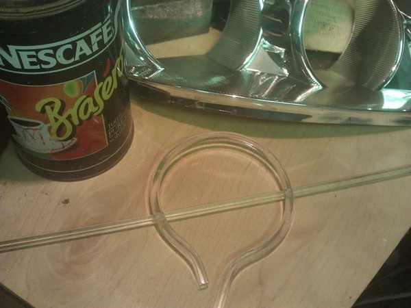 После ее внимательного изучения, а также не менее внимательного заглядывания в корпус фар, было принято решение, что мои выдумки должны уместиться в тесный корпус и на работу самих фар ничего не повлияет… После этого по диаметру цилиндров были подобраны круглые предметы, которыми оказались старая банка из-под кофе и обычная баночная крышка. Далее при помощи недавно прикупленного строительного фена аккуратно, не перегревая оргстекла, изгибаем отрезки прутка и придаем необходимую форму. Поскольку пруток имеет грани, нижнюю грань приходится плотно прижимать во избежание искривления. После этих действий видим примерно такую картину: