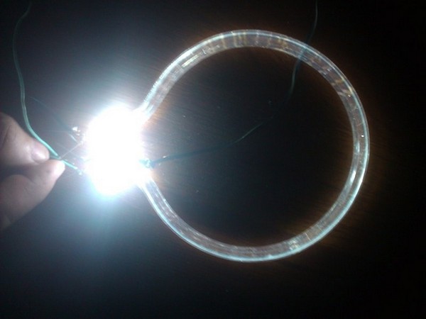После данной операции не терпелось хотя бы краешком глаза увидеть, как же будут гореть светодиоды в заготовках, вот и побежал подключить, выглядело это примерно так: