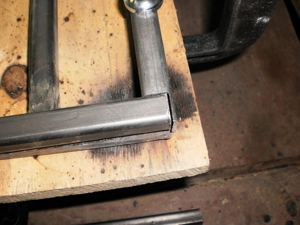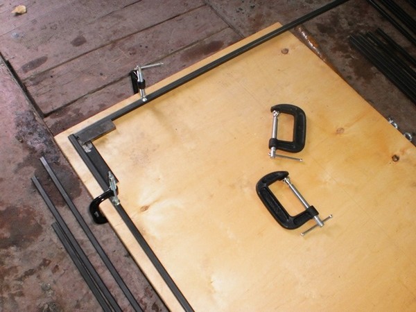 Для сварочного стола использовался кусок ДВП (см. картинки ниже) установленный на огрызки деревянных брусков, дабы приподнять над полом в гараже и было легче работать. Как показала практика — этого достаточно, не обязательно сварочный стол (т.е. требование ровной плоскости для сварки багажника!) должен покрывать всю площадь багажника. И так, берем ДВП, ставим на бруски, кладем на него отрезанный по размеру профиль, выравниваем по уголку и прижимаем струбцинами (понадобится минимум 2е, хорошо — 4е).