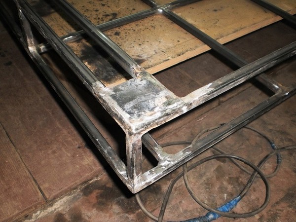 Сварив верх, берем стойки и удерживая одной рукой, привариваем их к низу. Подбивая слегка сварочным молотком, выравниваем конструкцию, кладем верх и все свариваем. Повозиться придется. Швы нещадно зачищаются на предмет красоты и отсутствия пещер, где может поселиться ржа. Дырки соответственно так же отсутствуют.