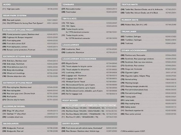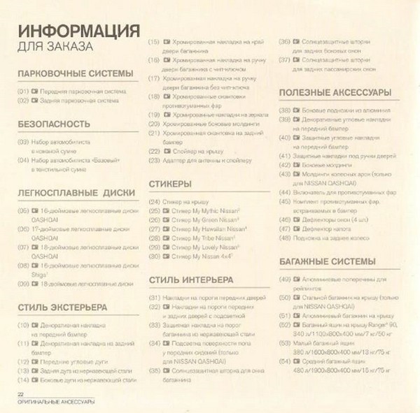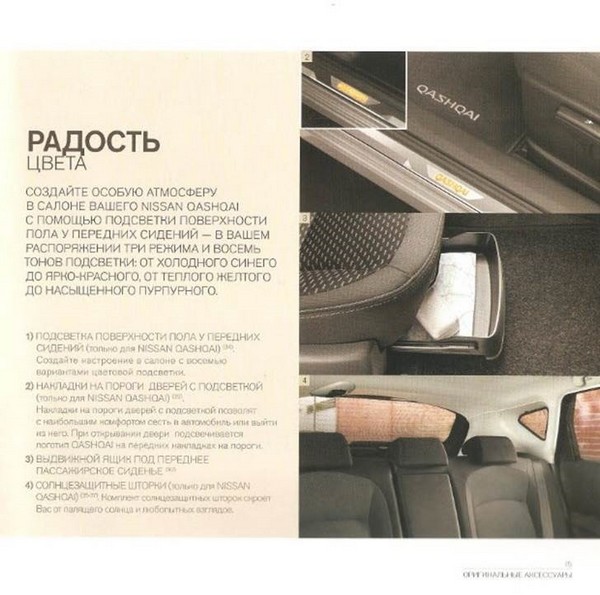 Не так давно попал мне в руки каталог оригинальных аксессуаров для автомобиля Nissan Qashqai и я с удивлением обнаружил в нём такие вещи как: подсветка пола у передних сидений, солнцезащитные шторки задних окон, спойлер и т.д.