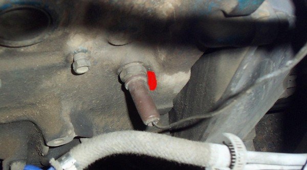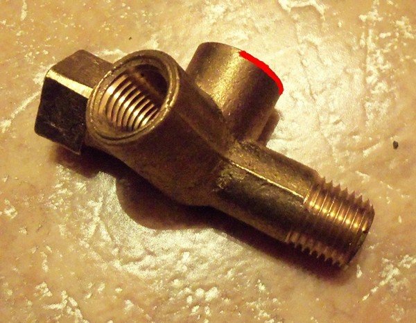Выкрутил датчик аварийки. Кто думает, что масло оттуда польется, то нечего оттуда не льется, разве что только пару капель, но это не страшно. И сразу взялся закручивать тройник. Остается 2 витка докрутить а он упирается в блок, вот в этом месте: