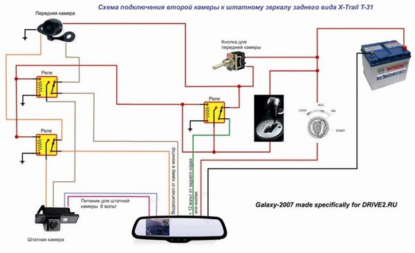 Работать схема должна просто: нажал кнопочку — включается передняя камера, включил заднюю передачу — включается штатная (задняя) камера, выключил заднюю передачу — опять включается передняя камера, выключил кнопочку — зеркало погасло.