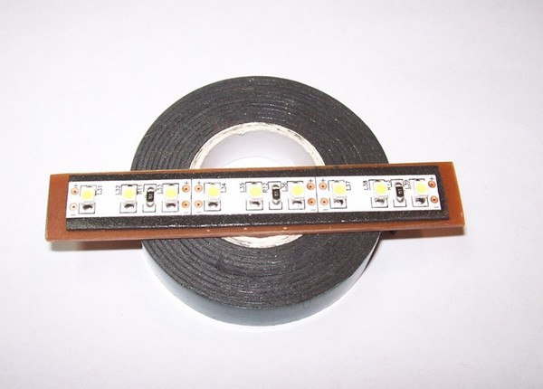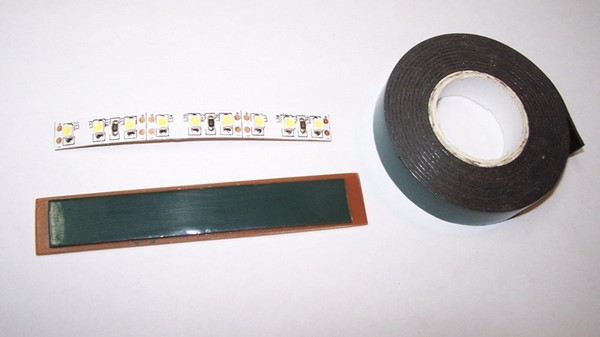 потом берём двухсторонний скотч для молдингов и клеем его на текстолит, а на него клеем светодиодную ленту.