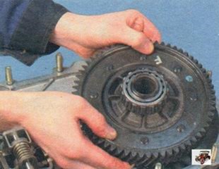 12. Сдвинув отверткой ведомую шестерню V передачи (тем самым спрессовав ступицу синхронизатора с вала), снимите с вторичного вала шестерню вместе с синхронизатором и вилкой.