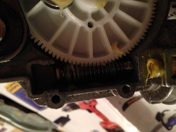 причина всего безобразия на поверхности — металлический "червяк"-привод моторчика, при определенных условиях (читай — все время) просто сжирает зубцы пластмассовой шестерни-привода поводка.