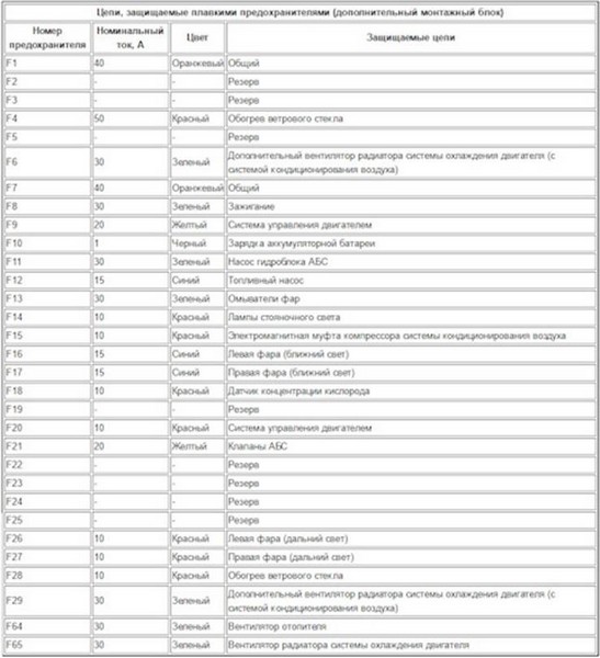 Предохранители дополнительного монтажного блока (под капотом)