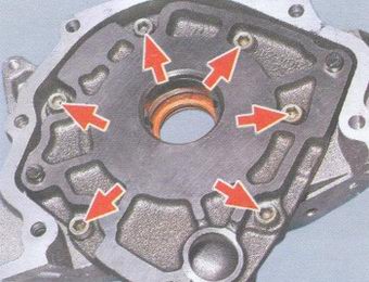 2. Отверните шесть болтов крепления крышки масляного насоса.