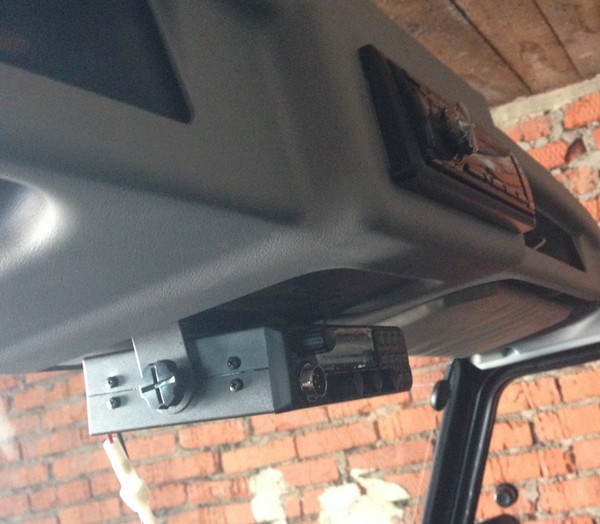 Пока детали сохли на солнышке приступили к установке радиостанции в салоне: сняли тент, прикрутили кронштейн крепления рации к полке (т.к. магнитола очень маленькая (без CD) снимать ее не потребовалось, болты вошли строго за магнитолой).