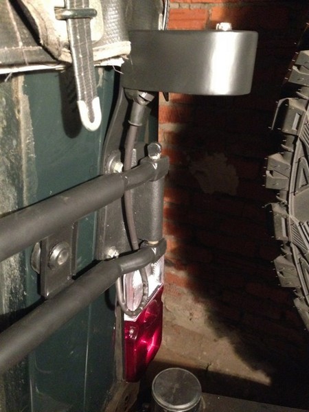 Вторая проблема была решена более радикально: было решено сверлить отверстие под провод антенны непосредственно в нижнем болту крепления кронштейна.