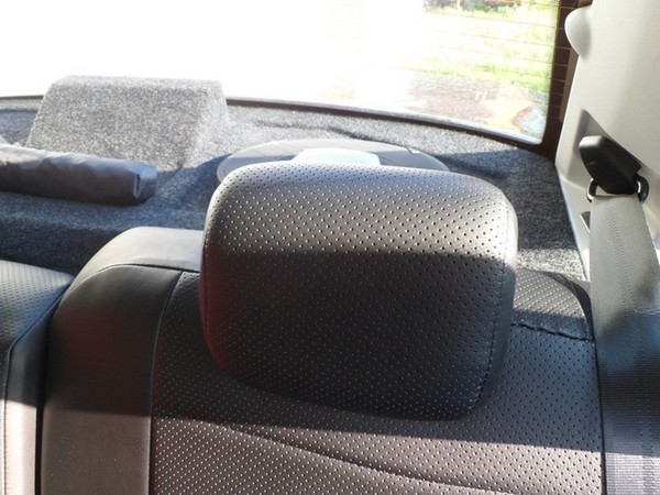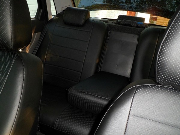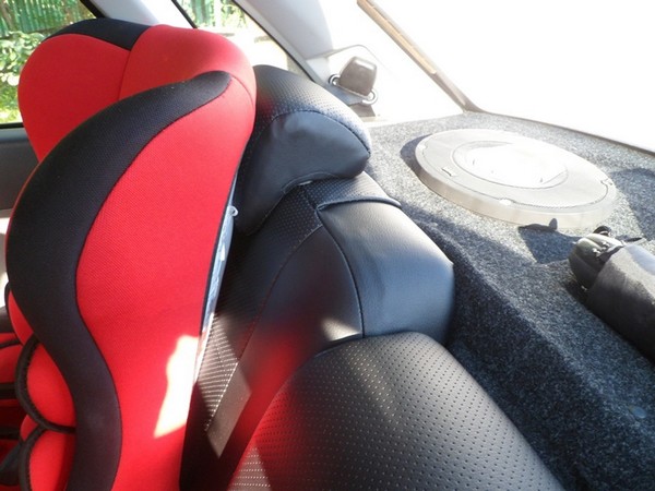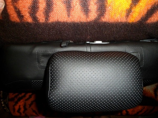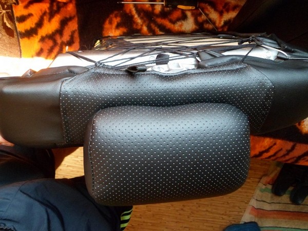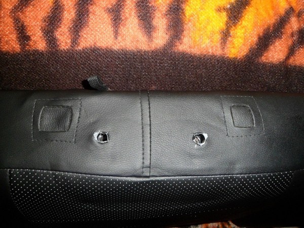 Село и обтянулось все хорошо, но, осталась у меня на виду (другие особо не замечали!) небольшая проблемка с пробитыми спинками задних сидений под подголовники старого образца. При установке чехлов проблему эту частично решил, закрыв дыры латками из лишних чехлов от старых подголовников.