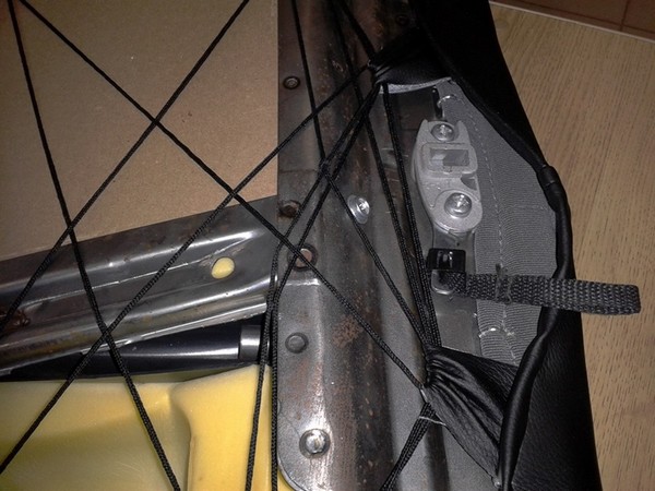 3. На задних спинках желательно открутить механизм защелки со шнурком и, натянув посильнее чехол, установить его обратно уже поверх кожи. Здесь вы выиграете в двух моментах — не нужно будет "с ноги" защелкивать спинки и наилучшая усадка чехла на спинку сиденья.