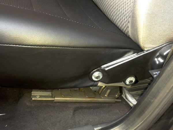4. На передних сиденьях со стороны двери нужно отвернуть один болт крепления пластиковой накладки механизма опускания спинки и уже после окончательной усадки чехла прикрутить его обратно, подсунув кожу под накладку и проткнув ее под болт.