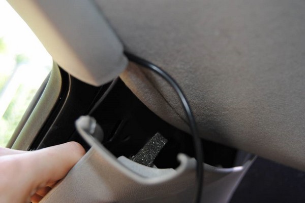 Дойдя до задней стойки, снимаем с неё обшивку. Проволокой просовываем провод по ходу штатного провода в багажник. Изолентой сматываем данные 2 провода друг к другу.