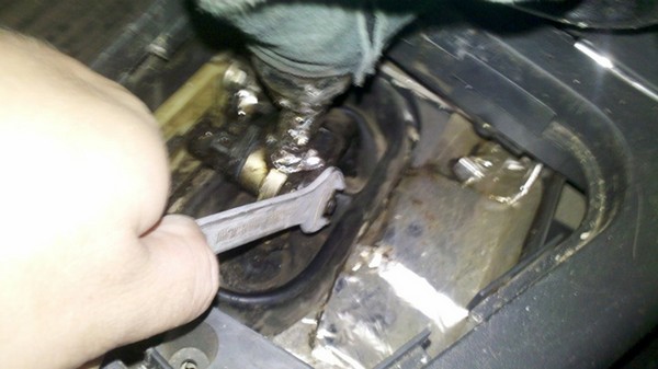 Затем следует снять рычаг КПП. Для этого откручиваем одну гайку и один винт.