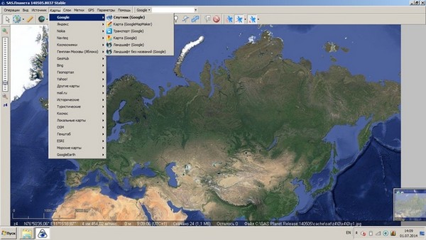 3. В основном рабочем окне выбираем карту, с которой хотим работать — покажу на примере спутниковой карты от Гугла.