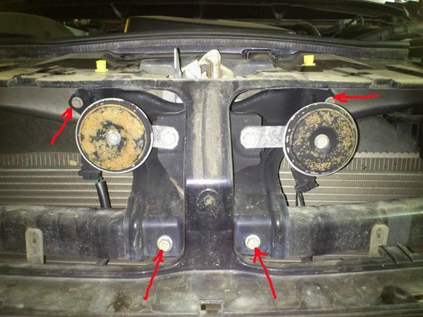 Снял решетку радиатора. Стрелками показаны болты крепления бампера, их нужно открутить (ключ на 10), так как будут мешать