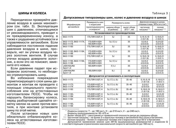 Рекомендации ВАЗ по давлению в колёсах Калина Спорт.