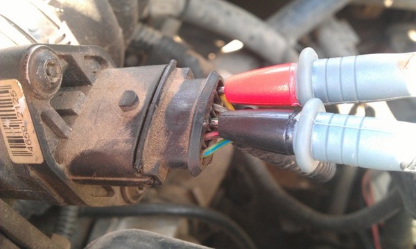 Первым делом подключаем мультиметр к контактам датчика массового расхода воздуха. ПЛЮС (Красный) к крайнему правом контакту, а МИНУС (Черный) к третьему контакту (считая, что справа, что слева)