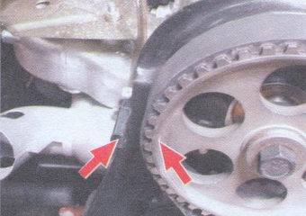 Метки ВМТ нанесены на зубчатом шкиве распредвала (выступ) и на задней крышке ремня привода распредвала (усик).