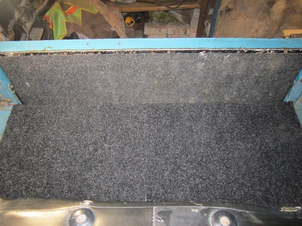 Верхнюю часть полки решил отделать техническим ковролином черного цвета, куски которого остались у меня с момента укладки на пол.